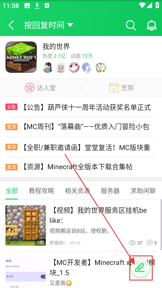 2、进入【我的世界】板块后,想发布内容就点击右下角绿色编辑按钮,超方便的呢。