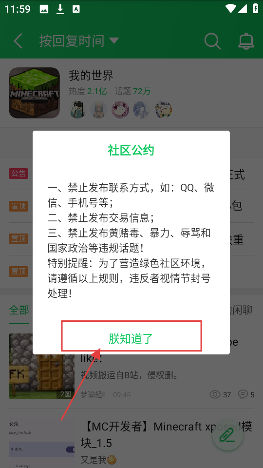3、发布前会弹出【社区公约】,仔细看看后点击【朕知道了】,就能继续操作啦。