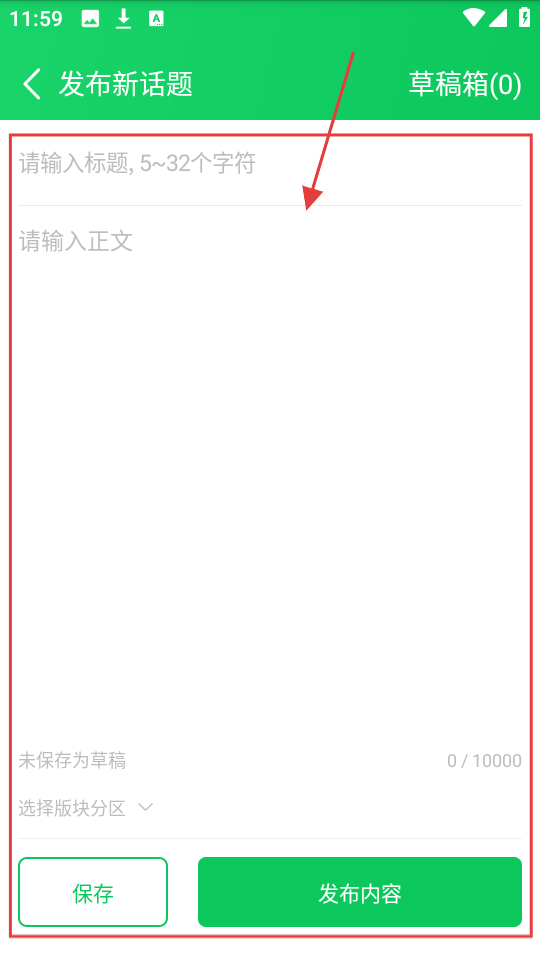 4、到了发布新话题页面,填写【标题】和【正文】,选好板块分区后就能发布内容咯。