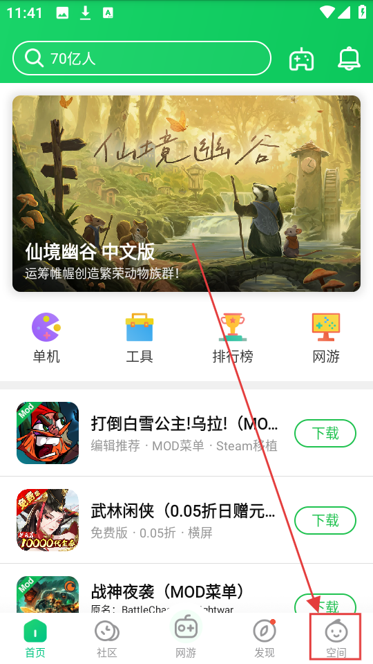 1、要进入个人功能区,就点击底部【空间】按钮哦,这里可是很多个人设置的入口呢。