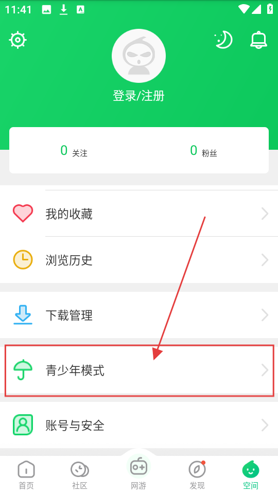 2、在个人页面里,找到【青少年模式】选项,想开启的话点击它准没错啦。