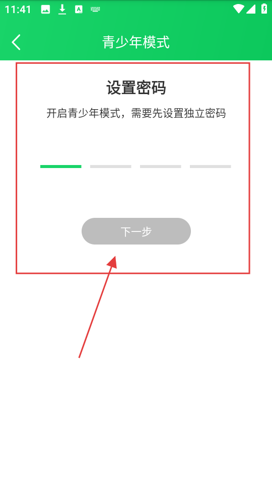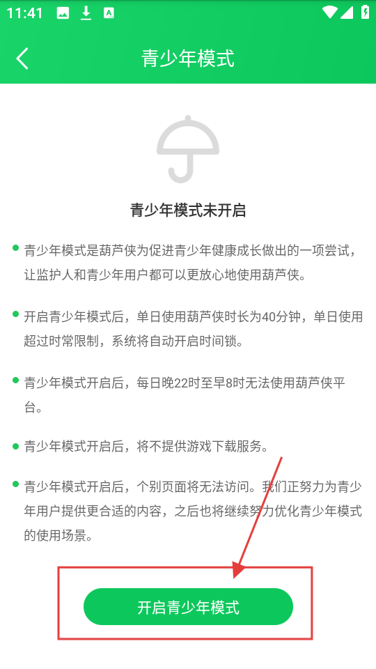 3、进入【青少年模式】页面,看到未开启状态,就点击绿色的【开启青少年模式】按钮吧。