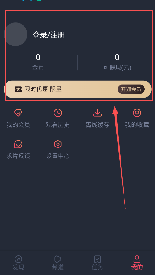 1、软件的核心功能围绕底部导航栏展开,“我的”页面负责账户管理,包括登录注册、查看金币和管理观看历史。