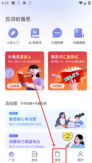 1、在百词斩雅思的主界面,点击底部的【课程】选项,可进入课程相关页面,开启雅思学习的课程模块啦。