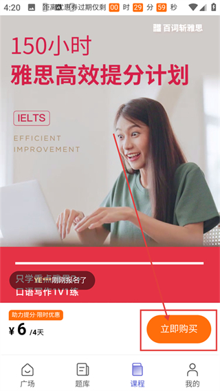 3、在课程推广页面,看到【150小时雅思高效提分计划】,点击【立即购买】可参与该限时优惠课程啦。