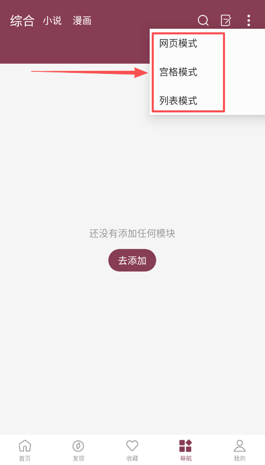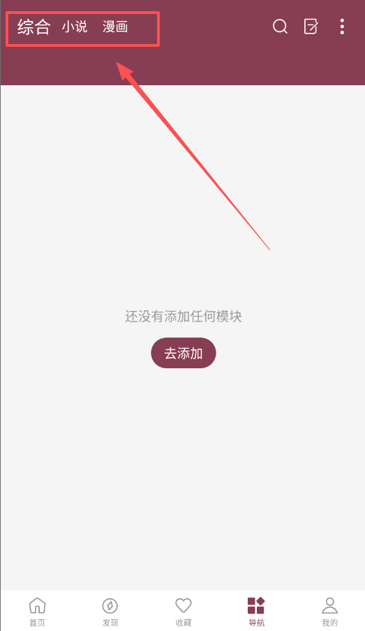 1、进入App后,首先在首页顶部选择综合、小说或漫画分类,这样首页就会显示定制化的信息流了。