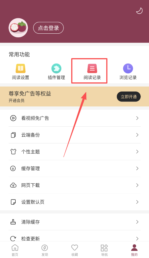 3、点击底部“我的”进行账号登录,登录后即可使用阅读设置、记录同步等功能,会员可享免广告、云端备份等特权。