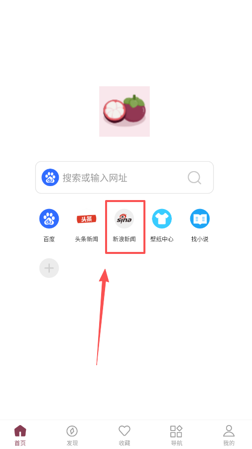 4、在“导航”页,既可直接搜索关键词,也能一键跳转预设站点如百度、新浪新闻或找小说平台,方便快速获取资讯与资源。