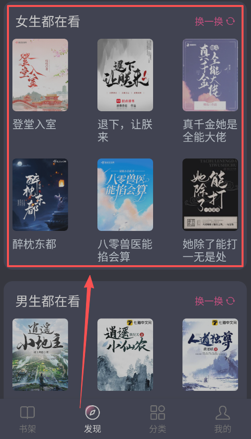 2、你可以根据首页的“猜你喜欢”和“男生女生都在看”来选书,也可以按分类精准寻找,看到合眼缘的,直接收藏或阅读就好。