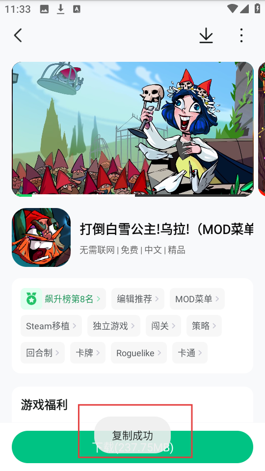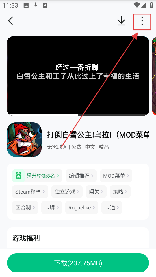 1、打开平台首页,找到目标游戏,比如【打倒白雪公主!乌拉!(MOD菜单)】,点击进入游戏详情页啦。