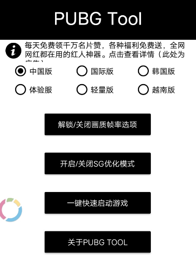 《pubgtool画质修改器无任务版》是一款基于Android系统的手游工具,主要用于修改游戏画面的显示效果。该软件具有简单易用、操作便捷、效果显著等特点,主要用于提高游戏画面的显示效果,让玩家在游戏中享受更加流畅、清晰的画面体验各类型的吃鸡游戏玩法。可以帮助玩家提高游戏画面的清晰度、流畅度等方面的表现。如果你是一位手游玩家,不妨下载试试这款软件,相信你一定会喜欢上它的。