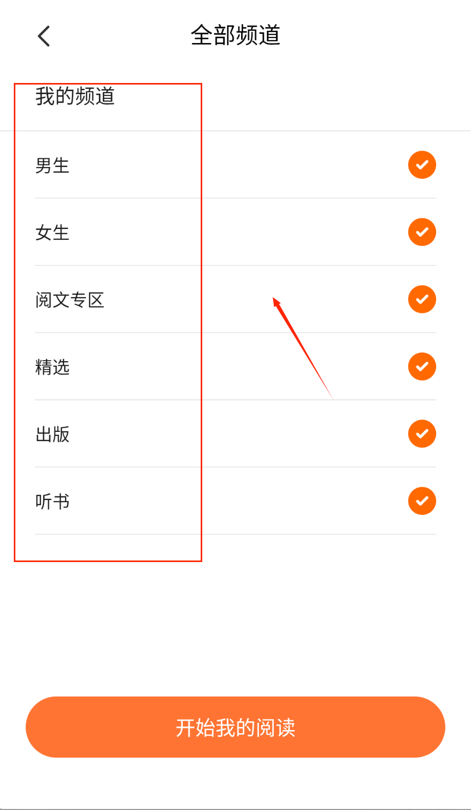 3、选好频道后点击底部橙色的"开始我的阅读"按钮,系统会根据你的选择推荐相应类型的小说内容。