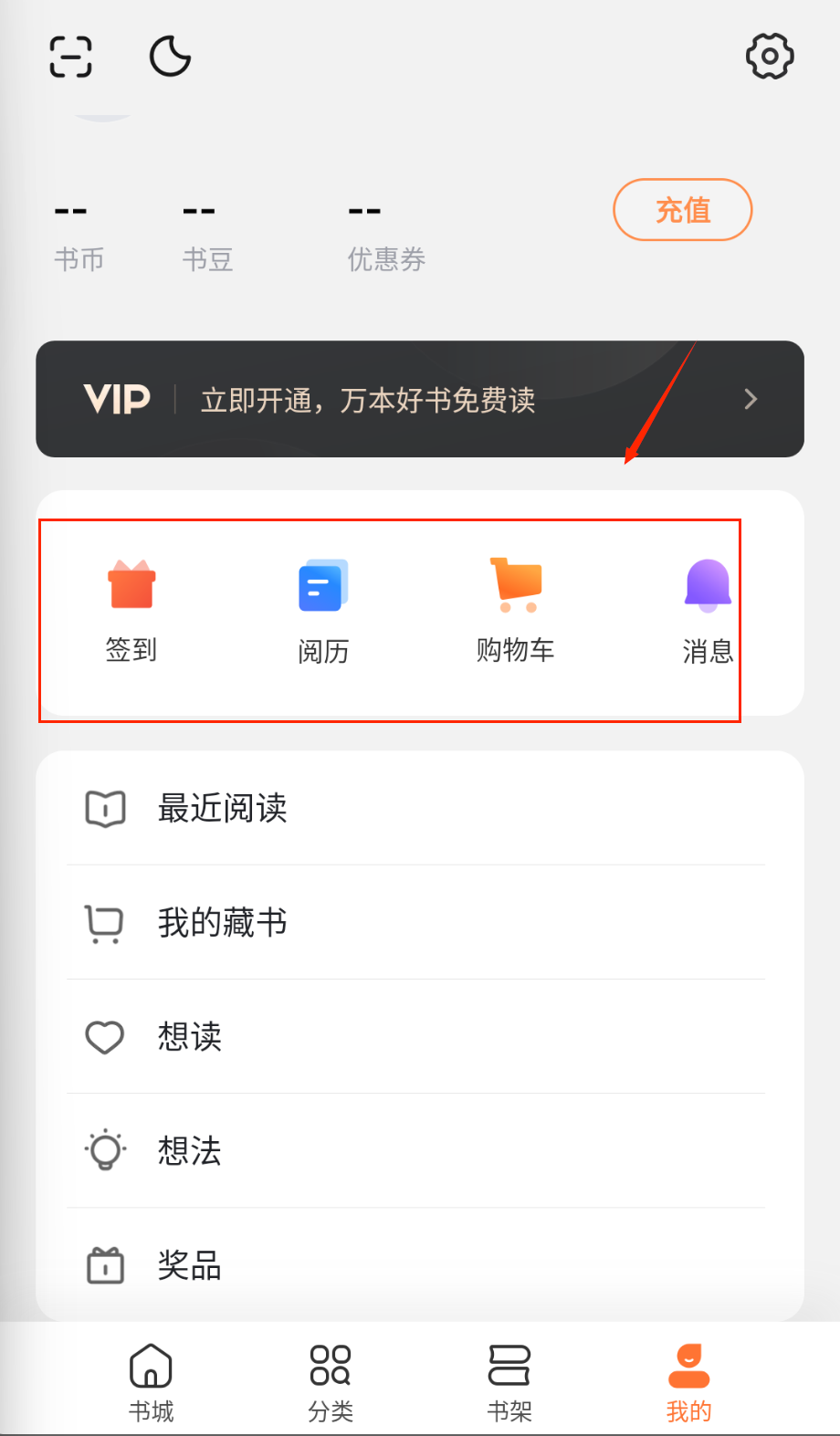 3、下方功能区有签到、阅历、购物车等图标,每天签到能积累奖励,阅历记录阅读历史,购物车管理待购作品。