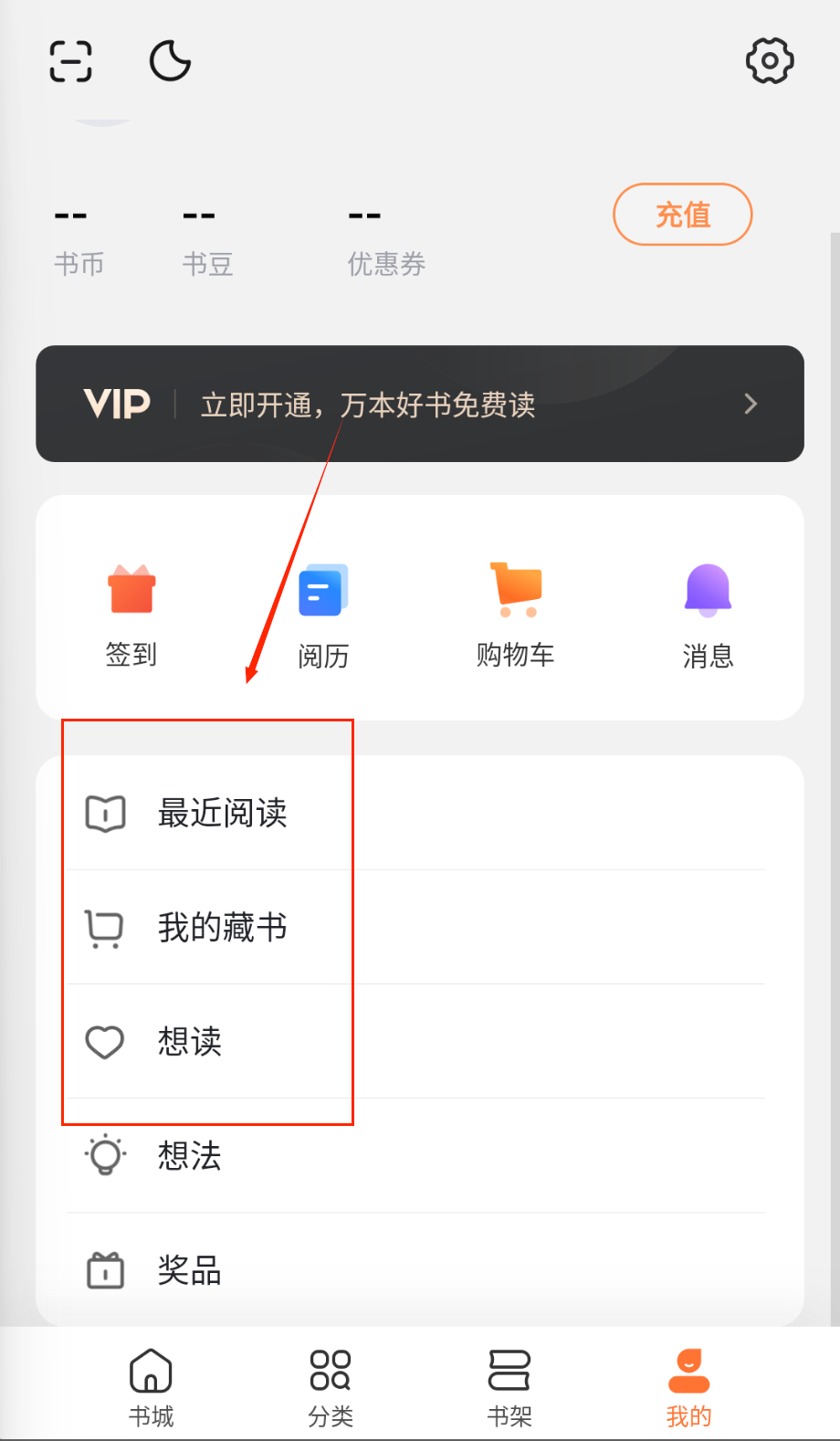 4、在"最近阅读""我的藏书"区域可以快速找到正在读和收藏的作品,"想读"列表规划阅读计划,"想法"区记录阅读心得。