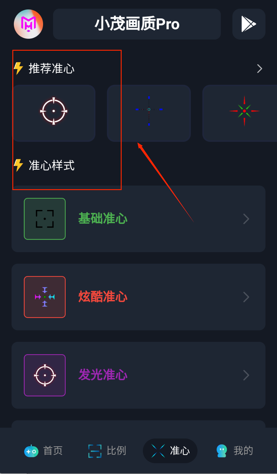 2、推荐准心里有系统精选的准星样式,准心样式页面提供更多个性化选择,可以预览效果后应用。