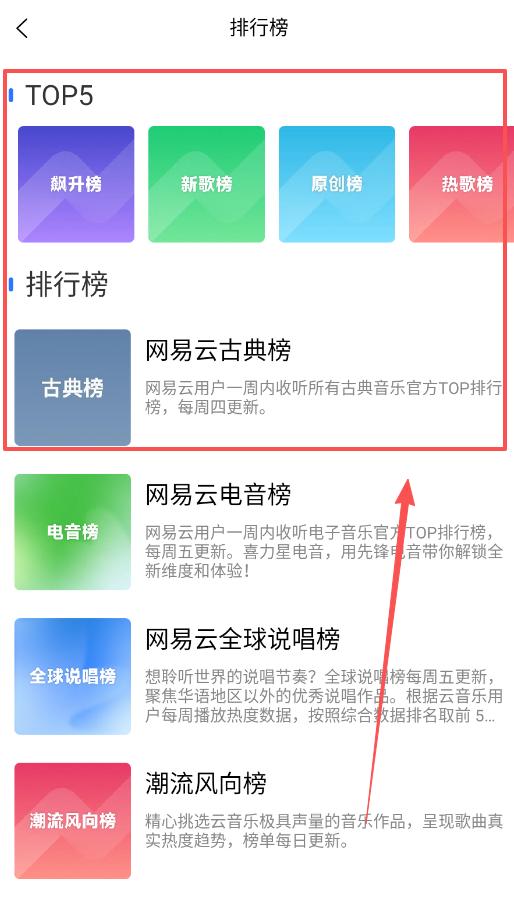 4、在“排行榜”区域,汇集了“飙升榜”、“热歌榜”等五大权威榜单,还有古典、电音等垂直分类榜,每个榜单都注明了更新频率。