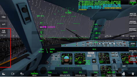 4,调整好襟翼后,我们就可以松开刹车BRAKE,然后滑动左侧的油门THR,将油门推到100%。