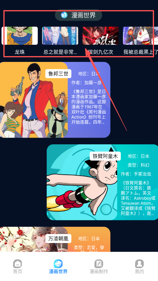 2、在漫画世界页面,你能看到龙珠、万道朝凰等各种作品,通过阅读摘要信息来快速决定下一本读什么,让找书的过程也变得很轻松。
