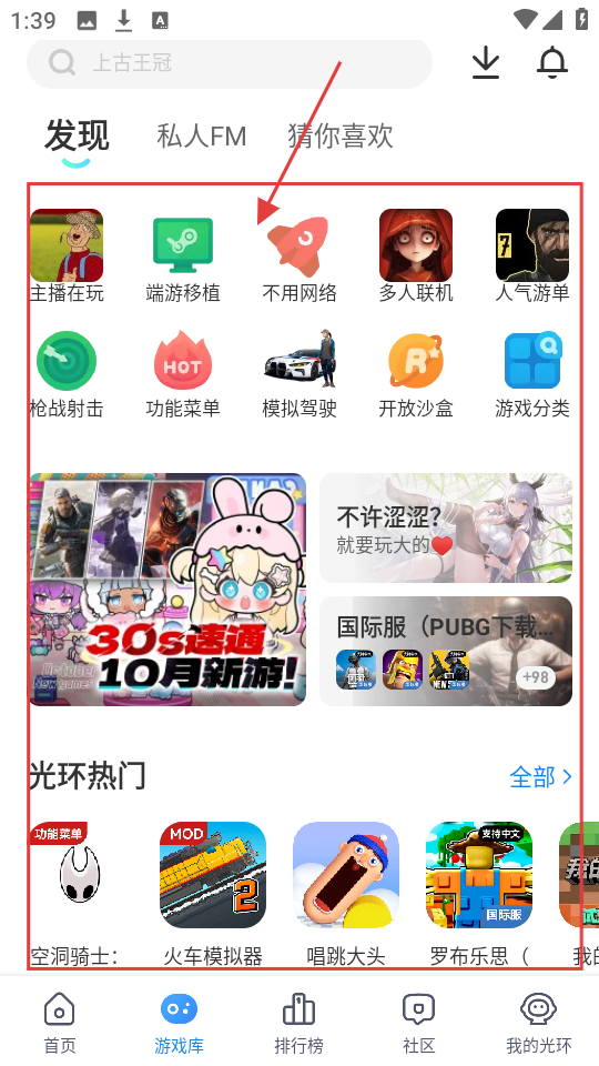 1、我们打开软件后,在【游戏库】页面能看到【主播在玩】【端游移植】等各类分类,还有热门游戏推荐,方便找喜欢的游戏呢。