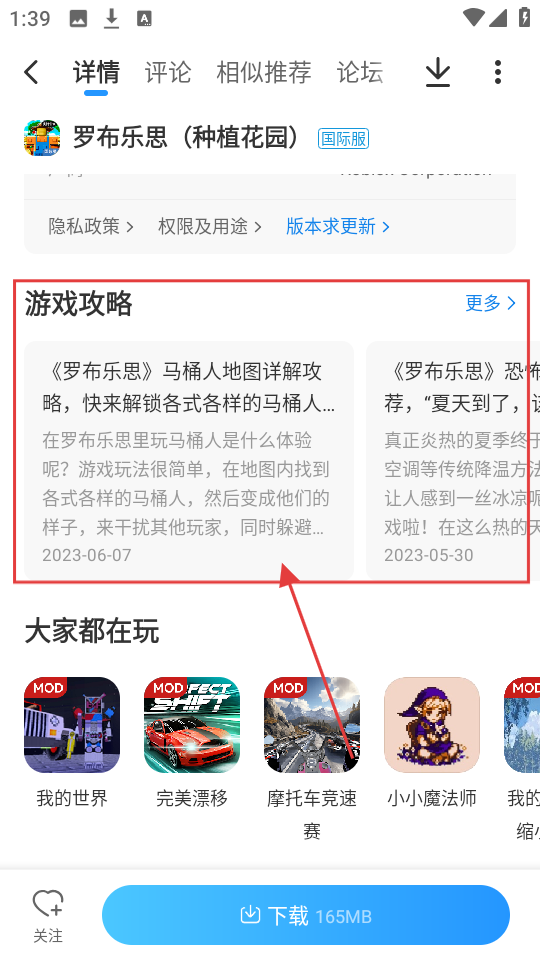 3、在《罗布乐思(种植花园)》详情页,我们向上滑动页面,能找到【游戏攻略】板块,点击攻略内容,就能查看详细的游戏玩法啦。