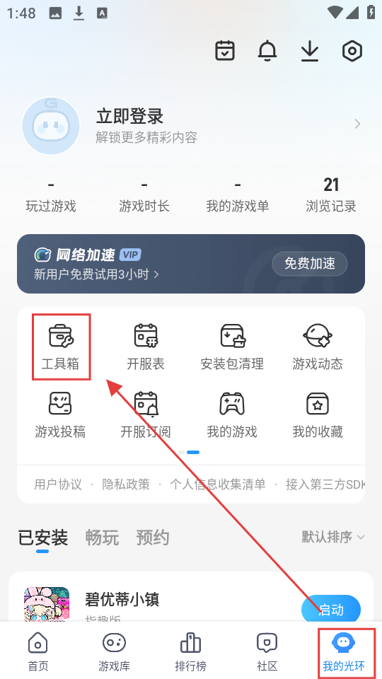 1、我们点击软件底部【我的光环】进入个人中心,能看到【工具箱】选项,点击它就能进入光环工具箱页面,去使用各类工具啦。