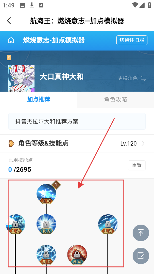 3、比如我们选择《航海王:燃烧意志-加点模拟器》,进入后能看到角色“大口真神大和”的技能加点界面,有不同技能可供操作。