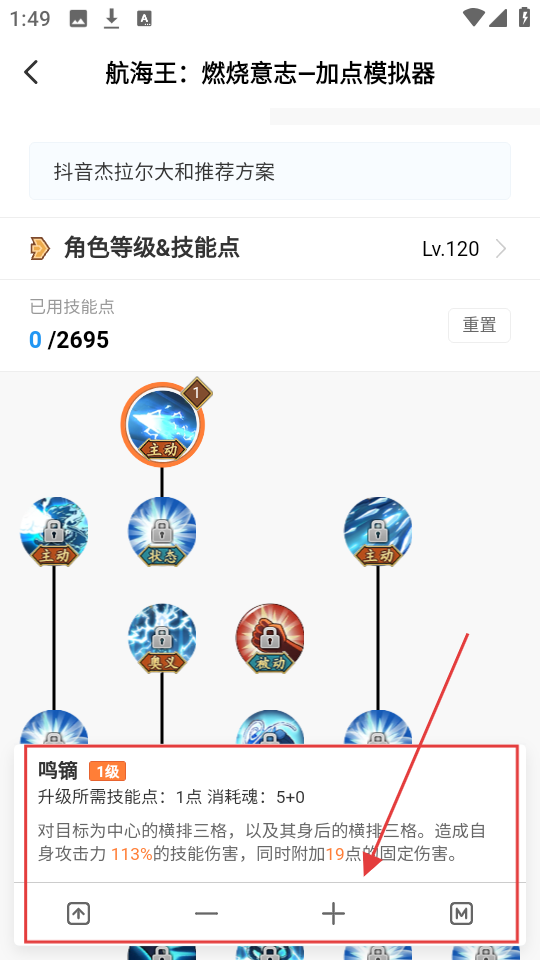 4、在技能加点界面,我们点击技能图标,像“鸣镝”技能,下方会显示技能详情,还能通过“+”“-”号来调整技能加点呢。