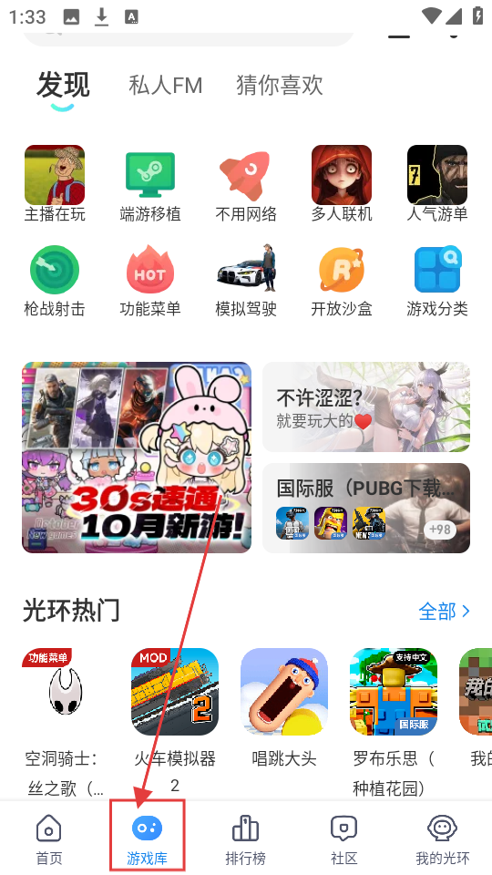 1、我们打开软件后,在底部导航栏能看到【游戏库】按钮,点击它就能进入游戏库页面,去探索各类游戏啦。