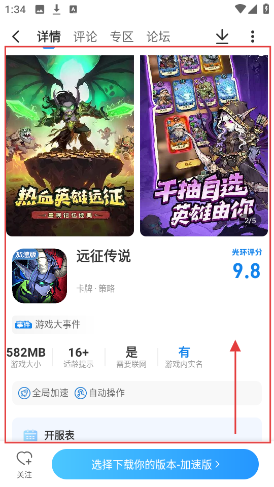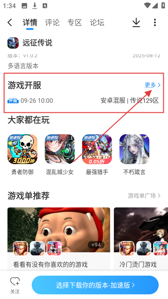 3、在《远征传说》详情页,我们可以向上滑动页面,找到【游戏开服】板块,然后点击【更多】,就能查看更多开服信息啦。