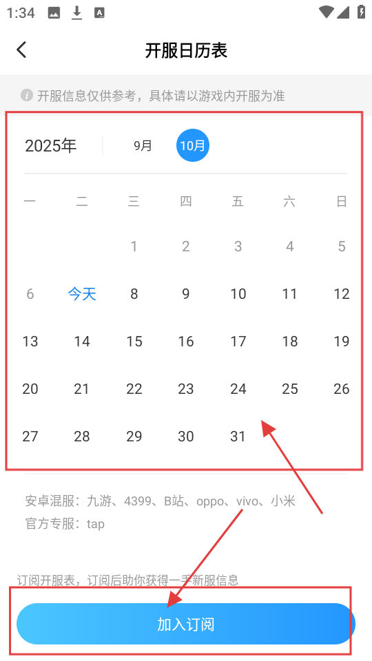 4、进入开服信息页面后,能看到开服日历表,要是想及时获取开服消息,就点击页面底部的【加入订阅】按钮,这样就能订阅开服表啦。