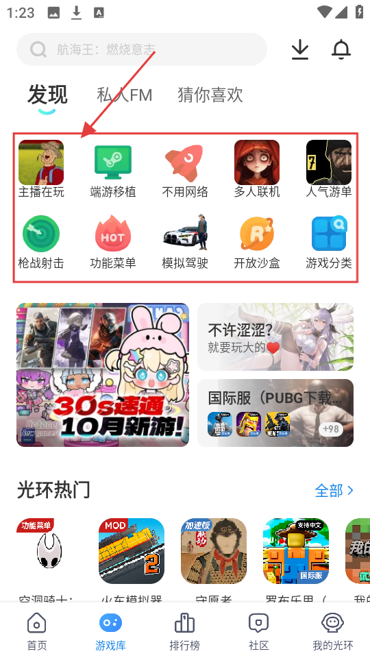 1、进入软件的【游戏库】页面后,能看到有【主播在玩】【端游移植】等各类分类选项,点击感兴趣的分类,就能找到对应类型的游戏啦。