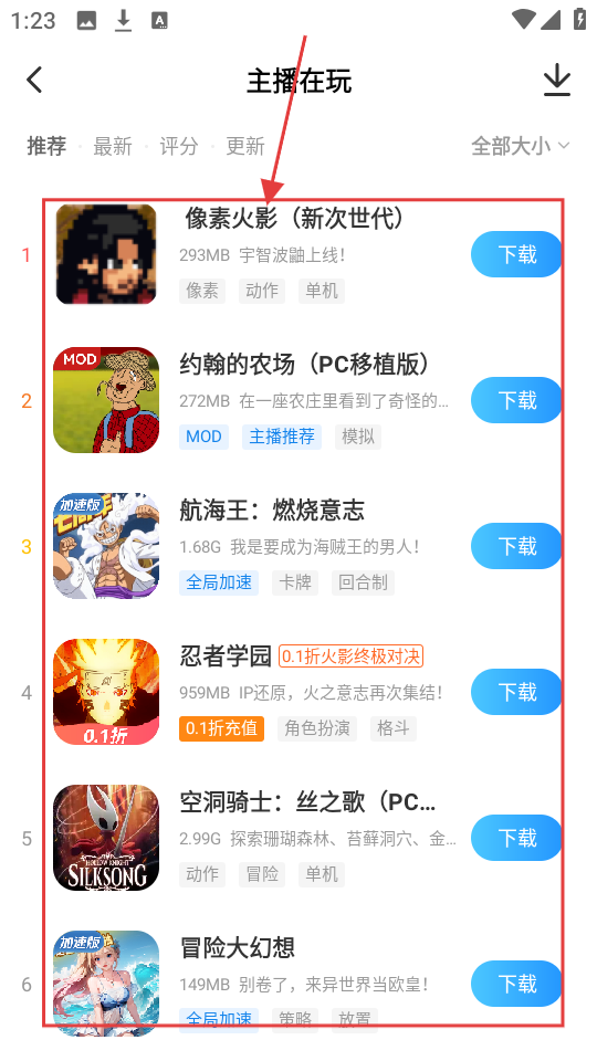 2、就像点击【主播在玩】分类后,会出现《像素火影(新次世代)》等多款游戏,我们可以挑选想玩的游戏。