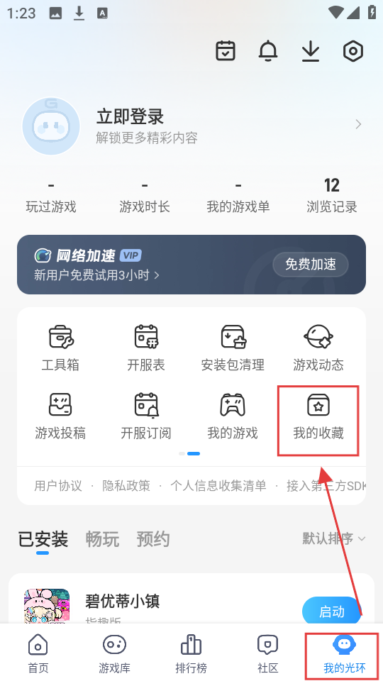 4、要是想查看收藏的游戏,就点击底部【我的光环】进入个人中心,然后在页面中找到【我的收藏】选项,点击它就能看到收藏的游戏啦。