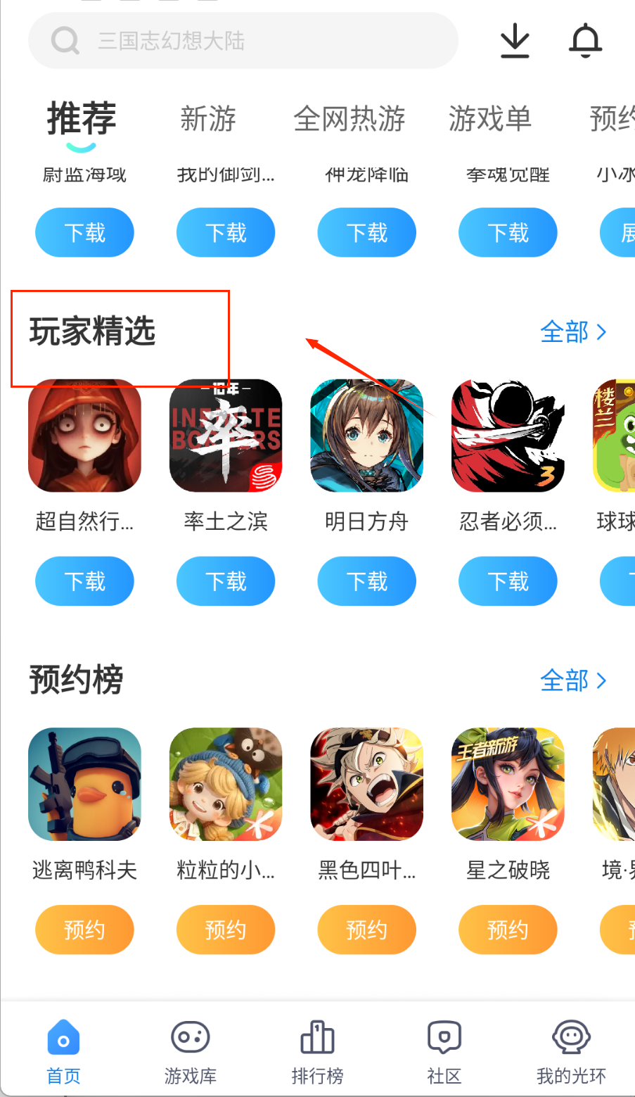 2、在首页可以通过顶部搜索栏查找特定游戏,输入名称或关键词就能快速定位,下方推荐板块会展示热门游戏如"明日方舟""鸣潮"等。