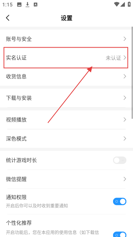 3、在设置页面里,我们能看到【实名认证】选项,现在显示的是未认证状态,点击它就可以进入实名认证的流程,也能查看认证相关情况啦。
