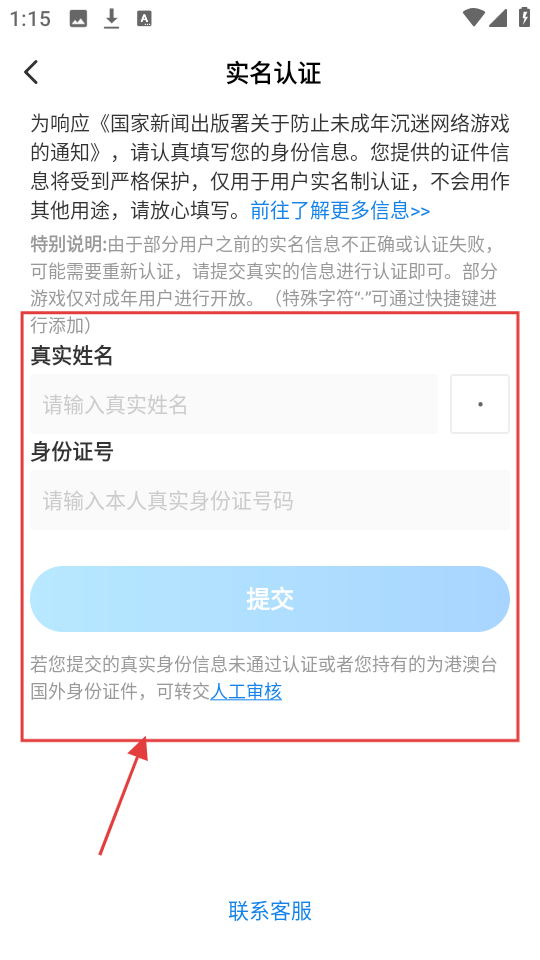 4、进入实名认证界面后,按照提示填写真实姓名和身份证号,填好后点击【提交】按钮,完成实名认证,后续也能在这查看认证信息。