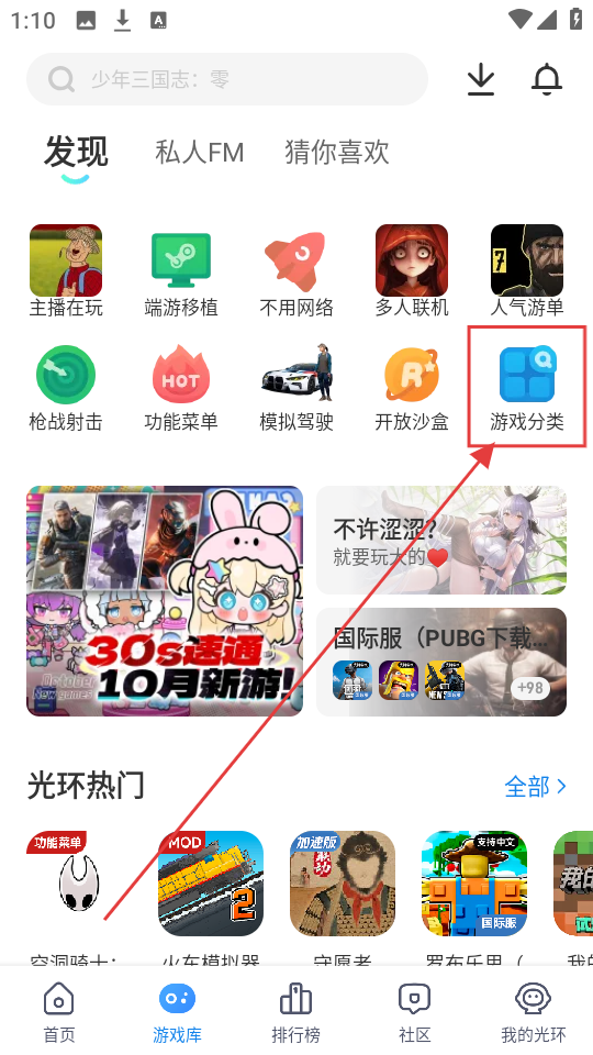 2、进入游戏库页面,找到【游戏分类】选项,点击可进入游戏分类页面,按分类找游戏更方便咯。