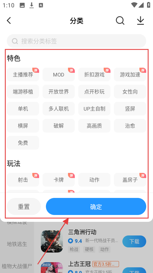 3、在游戏分类页面,有特色、玩法等分类标签,选择心仪标签,点击【确定】,筛选出对应游戏。
