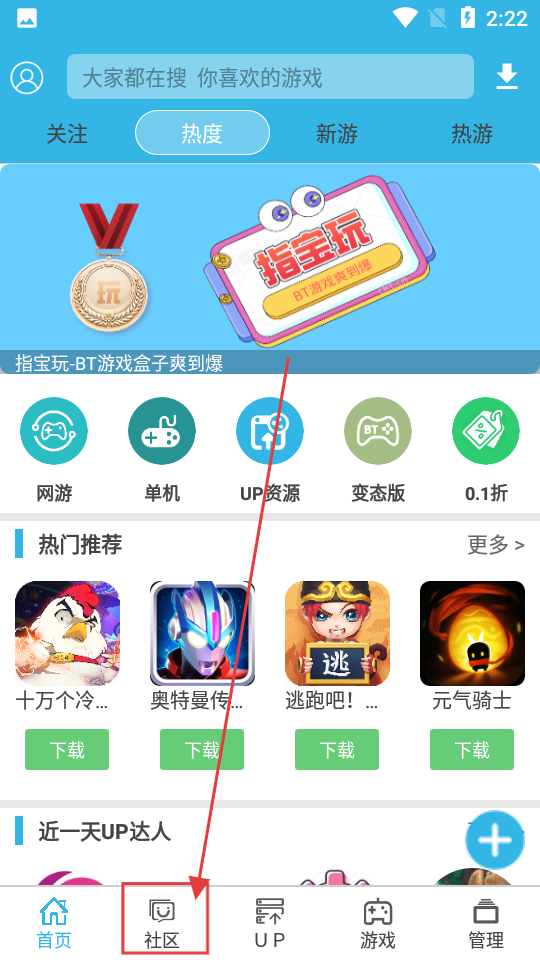 1、在首页底部导航栏找到【社区】按钮,点击进入社区页面,就能开启游戏交流等相关操作啦。