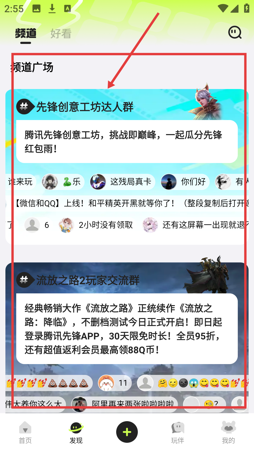 1、在频道广场选感兴趣的频道,像【先锋创意工坊达人群】,点击进入频道聊天界面哦。