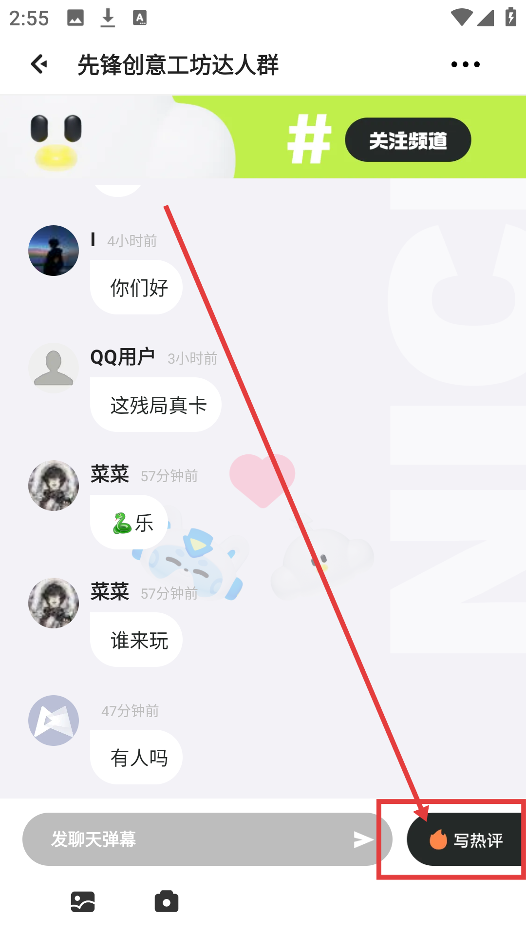 2、在频道聊天界面点击【写热评】,进入写热评界面,准备发表评论啦。