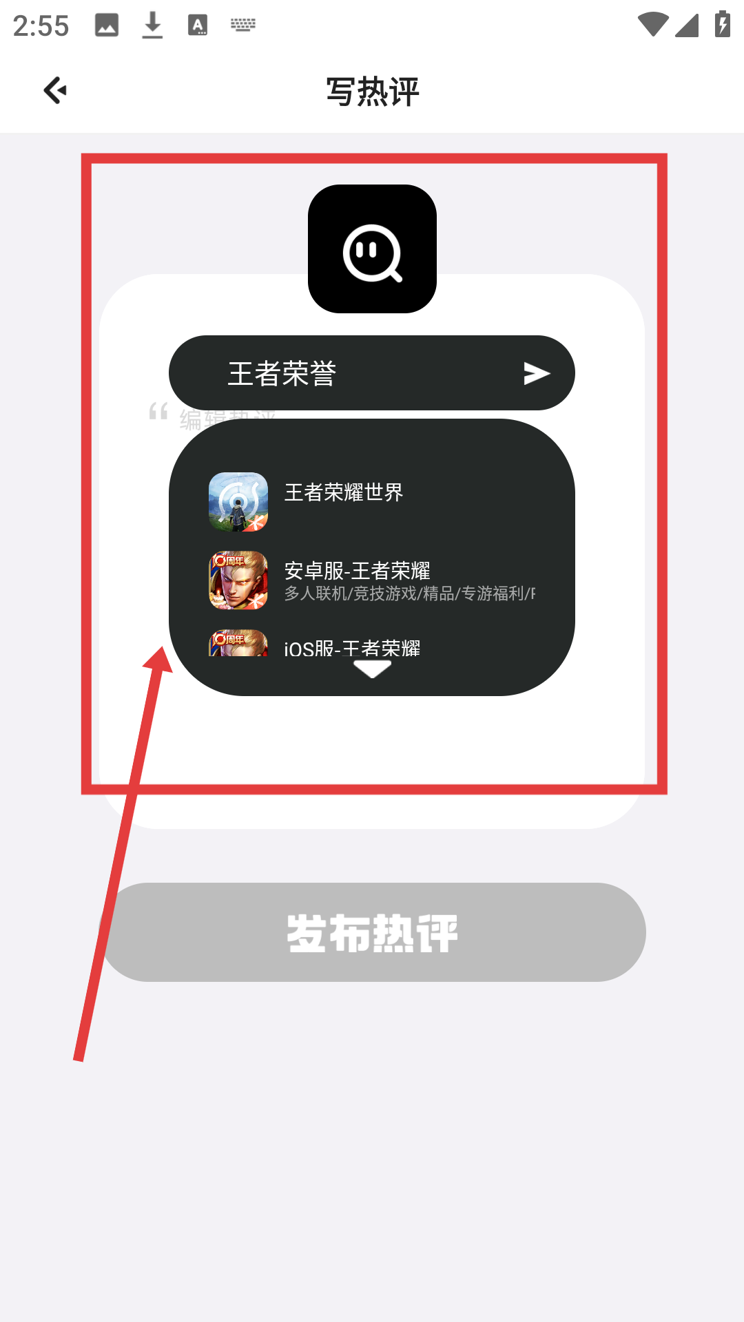 3、在写热评界面选要评论的游戏,像【王者荣耀】相关选项,点击进入评论编辑界面哦。