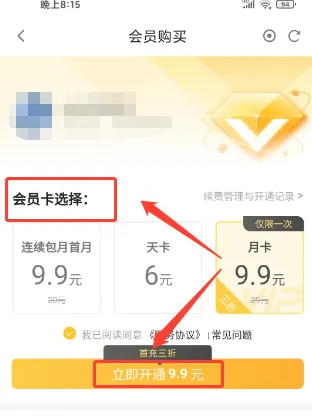 2、进入会员购买,选择会员卡,点击(立即开通)选项。