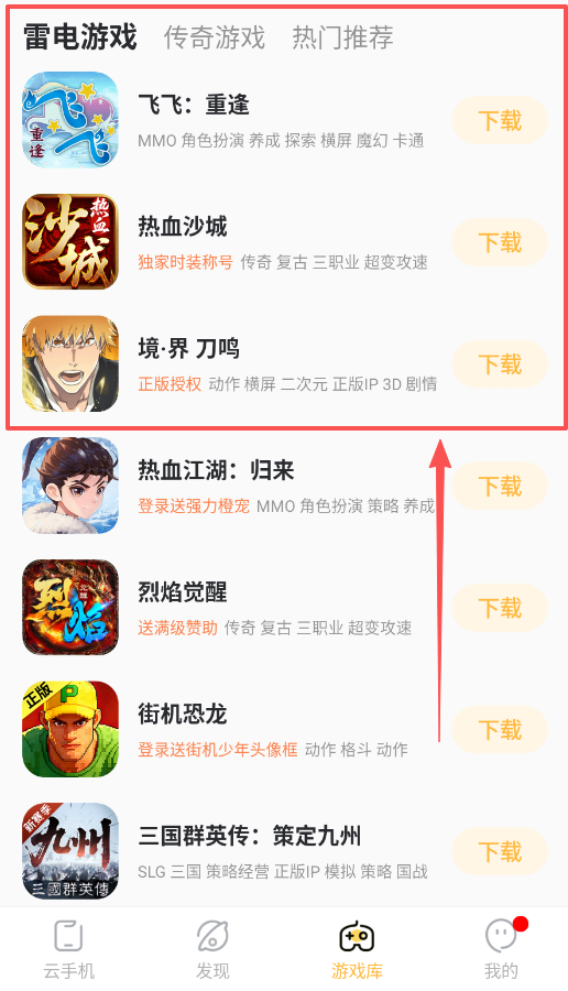 4、游戏安装很简单,在“游戏库”中选择你感兴趣的类别,比如传奇或热门推荐,直接点击游戏下方的下载就能自动安装了。