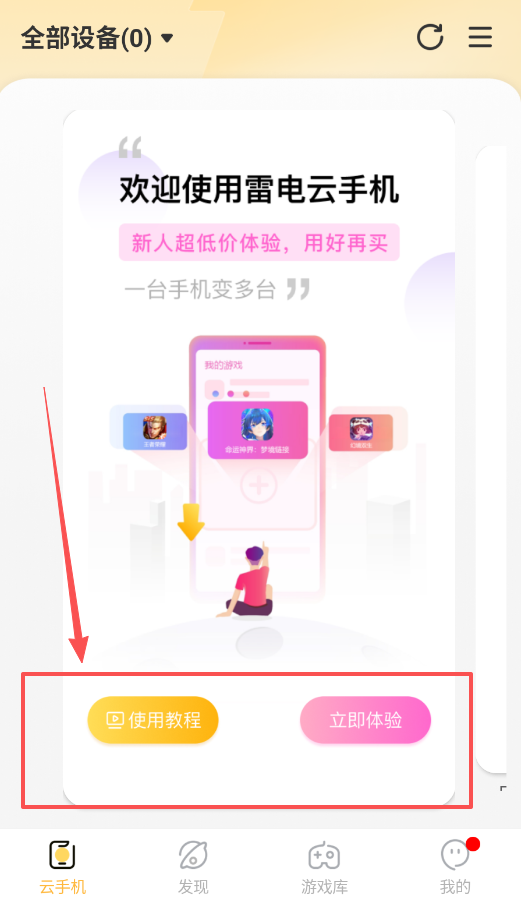 2、成功登录后,你会在“全部设备”页面看到欢迎语,点击“立即体验”就能开启云手机,还可以查看“使用教程”学习基本操作。