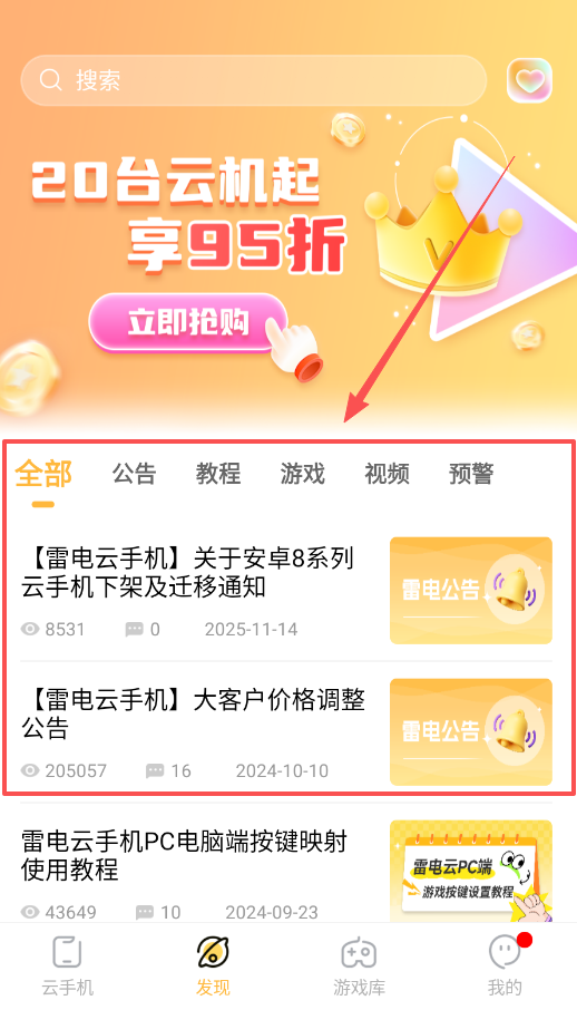 3、在发现页面呢,你可以浏览公告和教程,了解云手机的最新动态,比如安卓8系列下架通知,还能搜索特定内容。