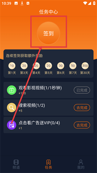 3、在任务中心页面,点击【签到】,可完成每日签到,获取签到奖励啦。