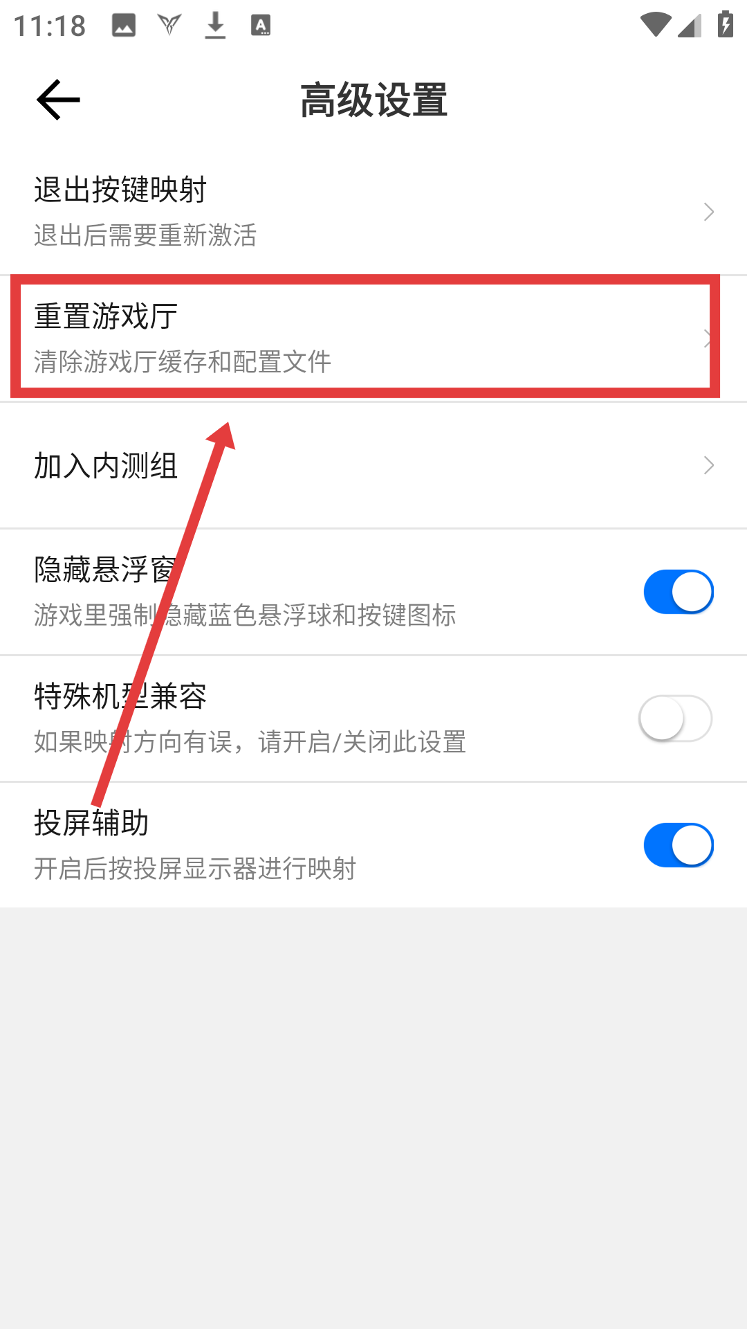 3、在高级设置页面,点击【重置游戏厅】,可进入重置确认页面啦。