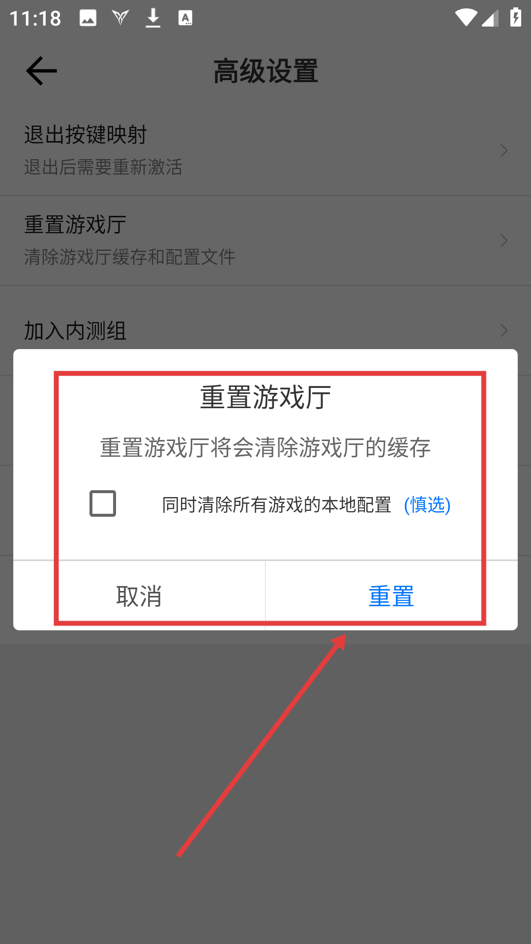 4、在重置确认页面,可选择是否同时清除所有游戏本地配置,点击【重置】,即可完成游戏厅重置哦。
