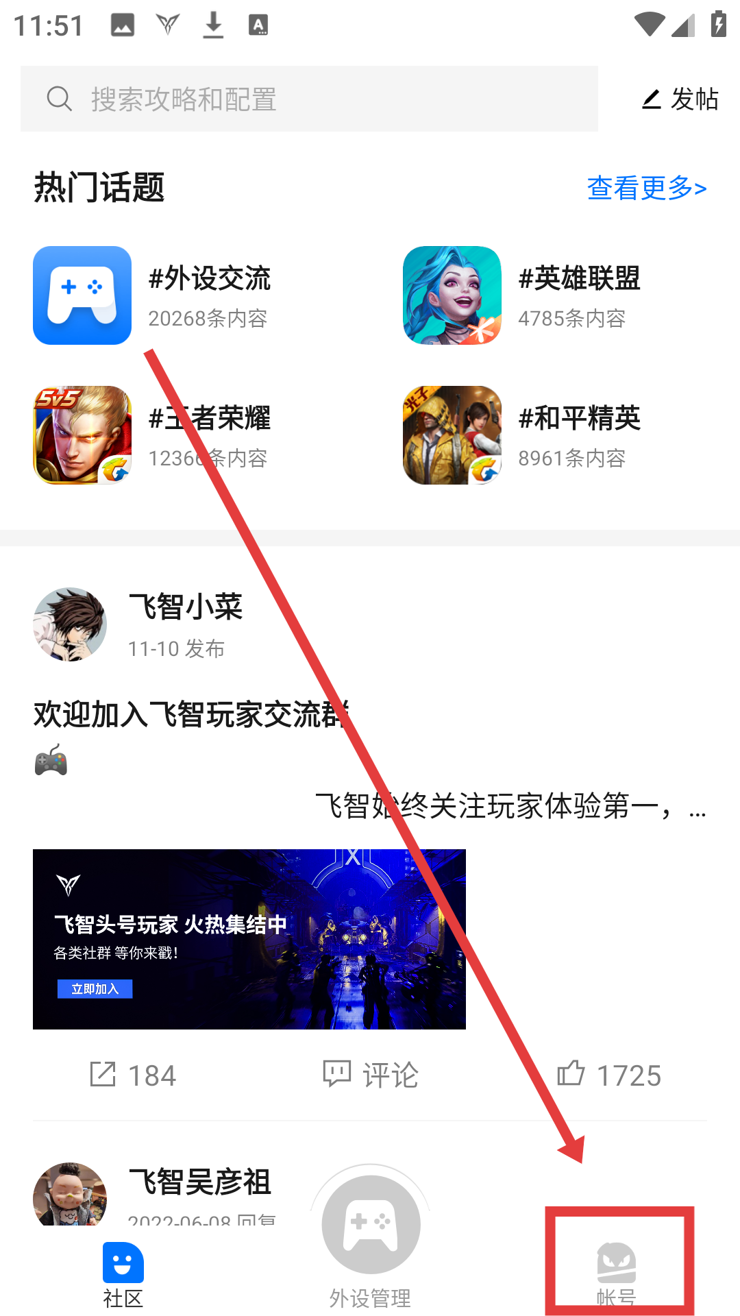1、在社区页面,点底部【帐号】,可进入账号页面管理个人设置哦。